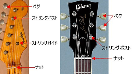 ヘッドには弦を巻きつけるストリングポスト、ストリングポストを巻くためのペグ、弦のテンションを稼ぐ為のストリングガイド、弦を乗せるナットが付いている。