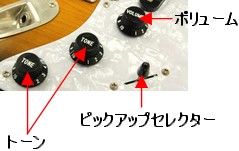 ピックアップで拾った音を調整するのが、ボリューム、トーン、ピックアップセレクターとよばれるコントロールノブだ。