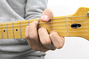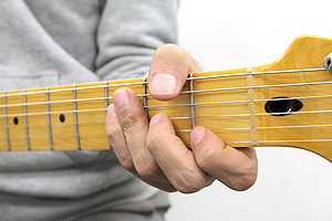 押さえていた指を力を抜いて軽く浮かせつつ、人差指で6弦に軽く触れて音が鳴らないようにしよう。