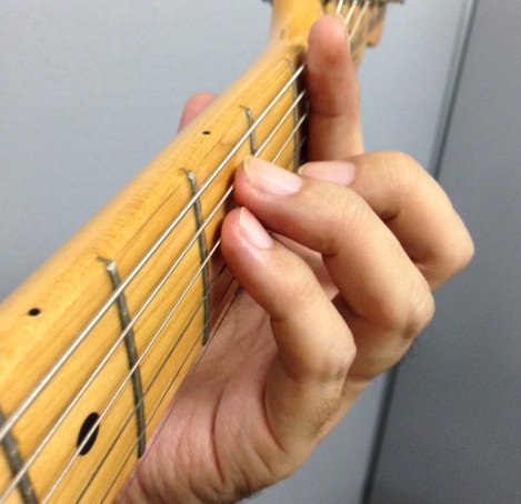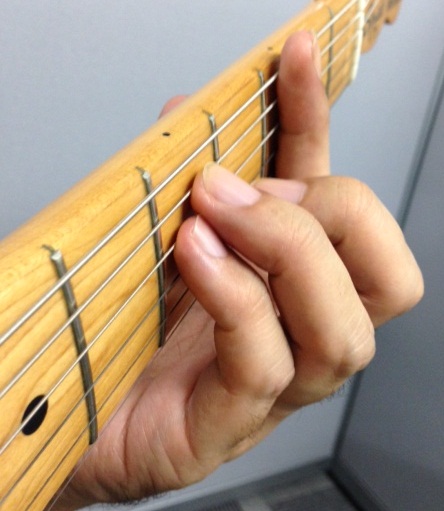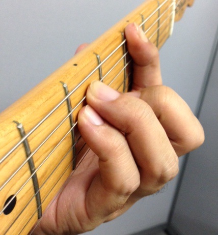▲コードを押弦している状態から、素早く指を寝かせてミュート。