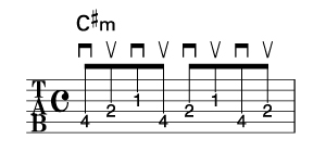 ▲右手は常にダウン/アップピッキングを一定のリズムで繰り返す。