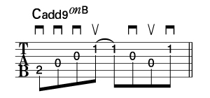 人差指で2弦1フレット、中指で5弦2フレットを押弦。