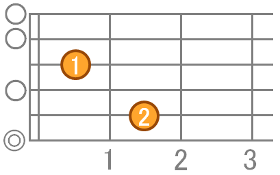 人差指で3弦1フレット、中指で5弦2フレット、薬指で4弦2フレットです。