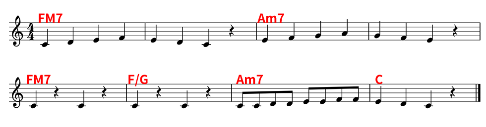 これをFM7⇒Am7⇒FM7⇒F/G⇒Am7⇒Cとしてみました。