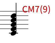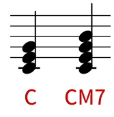 これに7度のB音を加えるとCM7(構成音:C,E,G,B)になり、ちょっとお洒落なコードになります。
