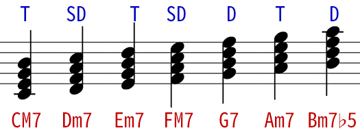 稀にどこに分類してよいか迷う特殊なコードも出てくる事もありますが、ダイアトニック以外のコードが出てきたときも、基本的には構成音を見てどこにT、SD、Dのどれに構成音が近いか、トライトーンがあるかを見ればどこかに分類できます。