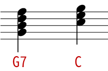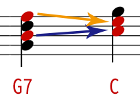 強進行というのは強力な進行で、G7⇒Cの場合はルートのG音⇒C音がこれにあたります。