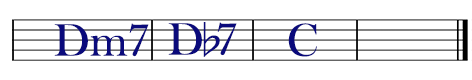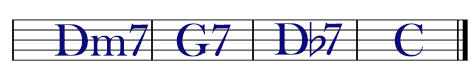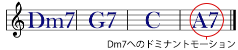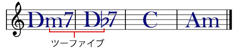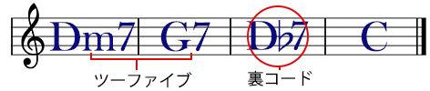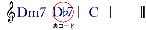 そしてDm7⇒D♭7は本来ツーファイブのDm7⇒G7を裏コードのD♭7に置き換えたパターンです。