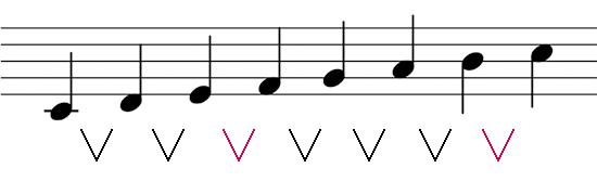 Vの左右の音の間隔が、黒字は全音、赤字は半音ですね。