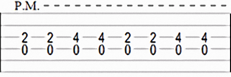 P.M.って何だ?と思うかもしれませんが、これはパームミュート(別名:ブリッジミュート)と言います。エレキギターで良く使われる奏法で、右手の小指側の側面(右図の赤い部分)をブリッジに乗せて、弦に軽く触れます。